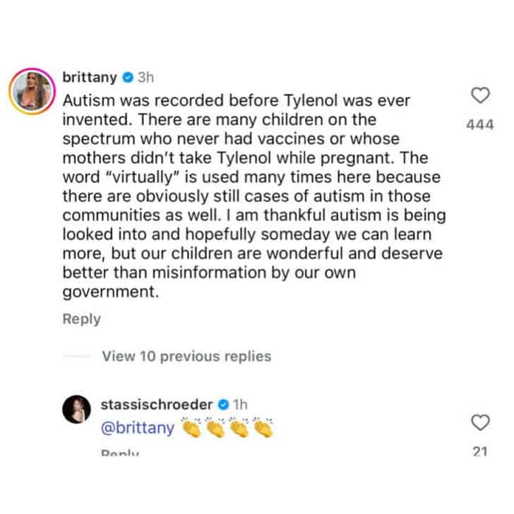 Brittany, whose son Cruz was diagnosed with autism spectrum disorder (ASD) at age 3, jumped into the Instagram conversation to set the record straight.