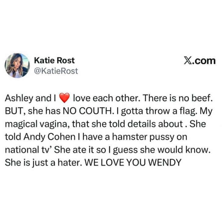 The former model took to X (formerly Twitter) with an NSFW message in support of Wendy, while appearing to throw some pointed shade at Ashley.
